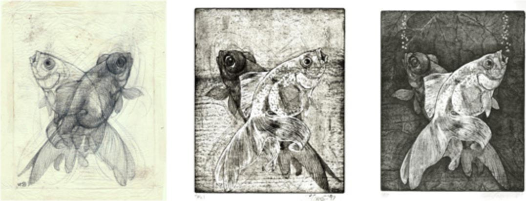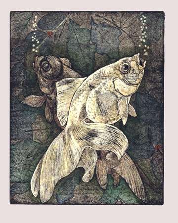 TWO GOOD FISHES: First the plate was ground, drawn, bitten, and printed. Then the plate was ground again, leaves were arranged and pressed onto the ground, after which the plate was re-bitten and printed again to achieve the affect of the fish swimming in foliage. When you look closely it is not clear whether they are in the water or not.